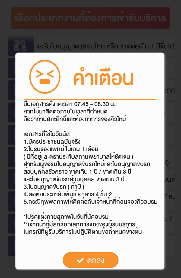 สำหรับ การจองคิวที่ต้องอบรมที่สำนักงาน เช่น การขอรับใบอนุญาตขับรถใหม่ การต่ออายุแบบอบรมที่สำนักงาน "ไม่สามารถเลื่อนคิวได้" เนื่องจากมีประกาศงด .